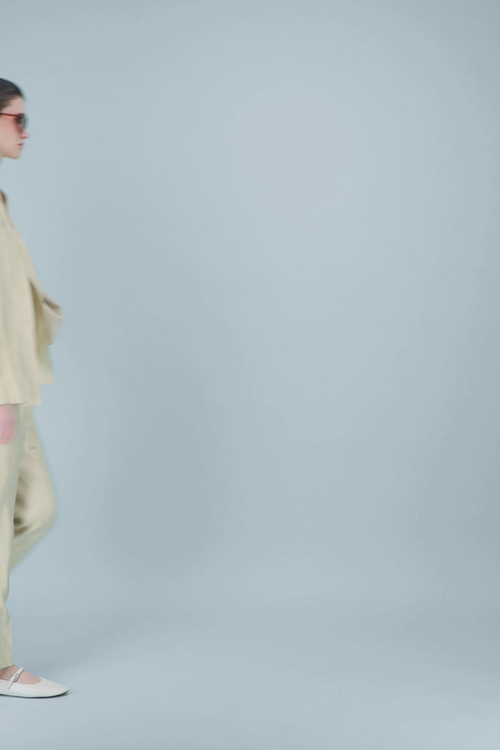 Le jaune clair de cette tunique se diffuse comme une lumière douce sur la peau. Le tissu, à la surface subtilement animée, donne à la pièce une présence presque mouvante. Le col tunisien ouvre la silhouette sans la contraindre, tandis que les manches, légèrement évasées, prolongent cette sensation de liberté. Une pièce pensée pour traverser la saison avec naturel, entre structure et fluidité.