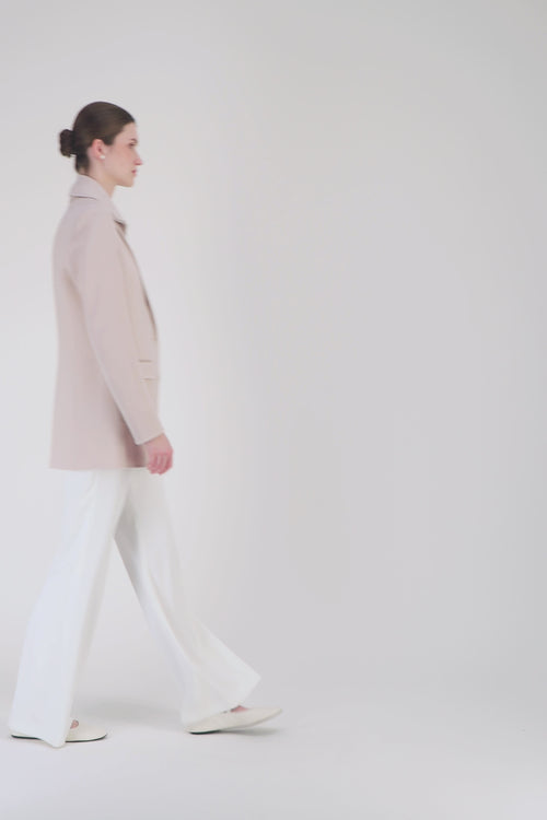 Le crêpe double face en laine est travaillé pour créer une matière à la fois souple et structurée, mettant en valeur les lignes de la veste et ses finitions contrastées.