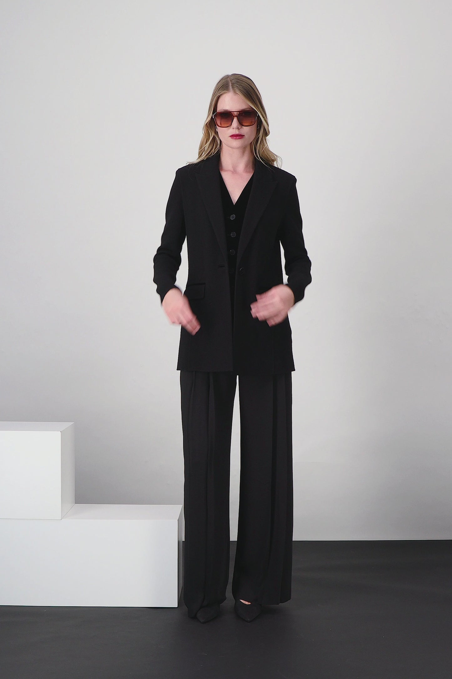This fitted black jacket in 100% wool combines structure and modernity. The single-breasted placket, tailored collar, and patch pockets highlight its mid-length, straight cut, while the integrated five-button jacket adds a distinctive and refined touch. Ideal for creating sophisticated looks or adding a chic touch to your everyday outfits.