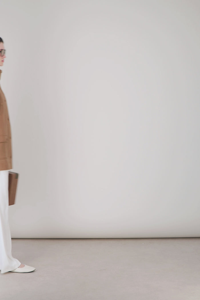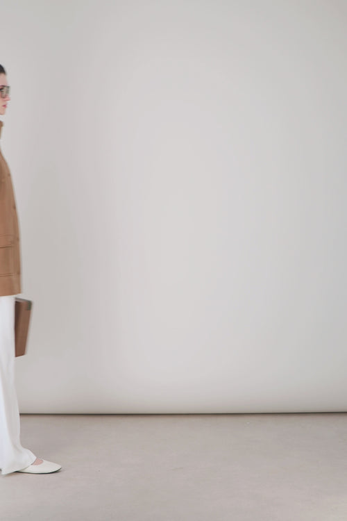 Conçu pour les saisons de transition, ce manteau oversize en flanelle de cachemire camel associe chaleur légère et allure contemporaine. Sa matière douce et enveloppante apporte un confort immédiat, tandis que la coupe ample structure la silhouette sans la contraindre. Le col montant protège le port de tête et renforce la ligne graphique de la pièce, complétée par des poches plaquées qui ajoutent une touche fonctionnelle.